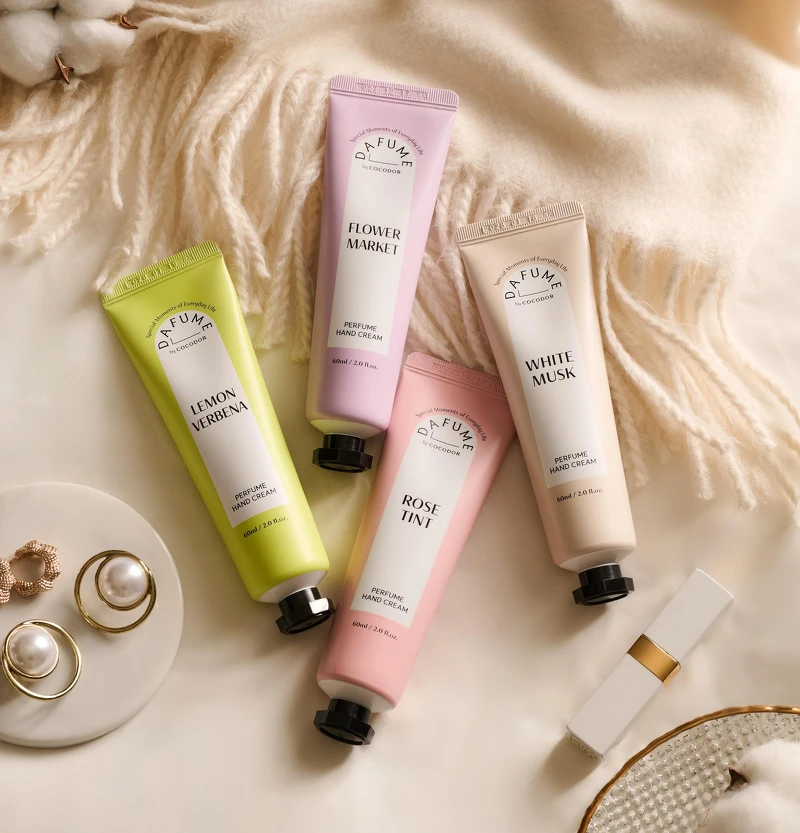 DAFUME香氛保湿柔嫩护手霜60ml,由左至右:柠檬马鞭草、花草市集、玫瑰印记、白麝香,单入定价NT$299,体验价NT$199。 另外,精緻女生的保养细节少不了呵护双手,DAFUME by COCODOR的,以5种植物油结合乳木果油加上6种草本萃取物为养肤成分,柔顺不黏腻的丝滑质地一抹就吸收,一年四季帮你养出细嫩仙女手。